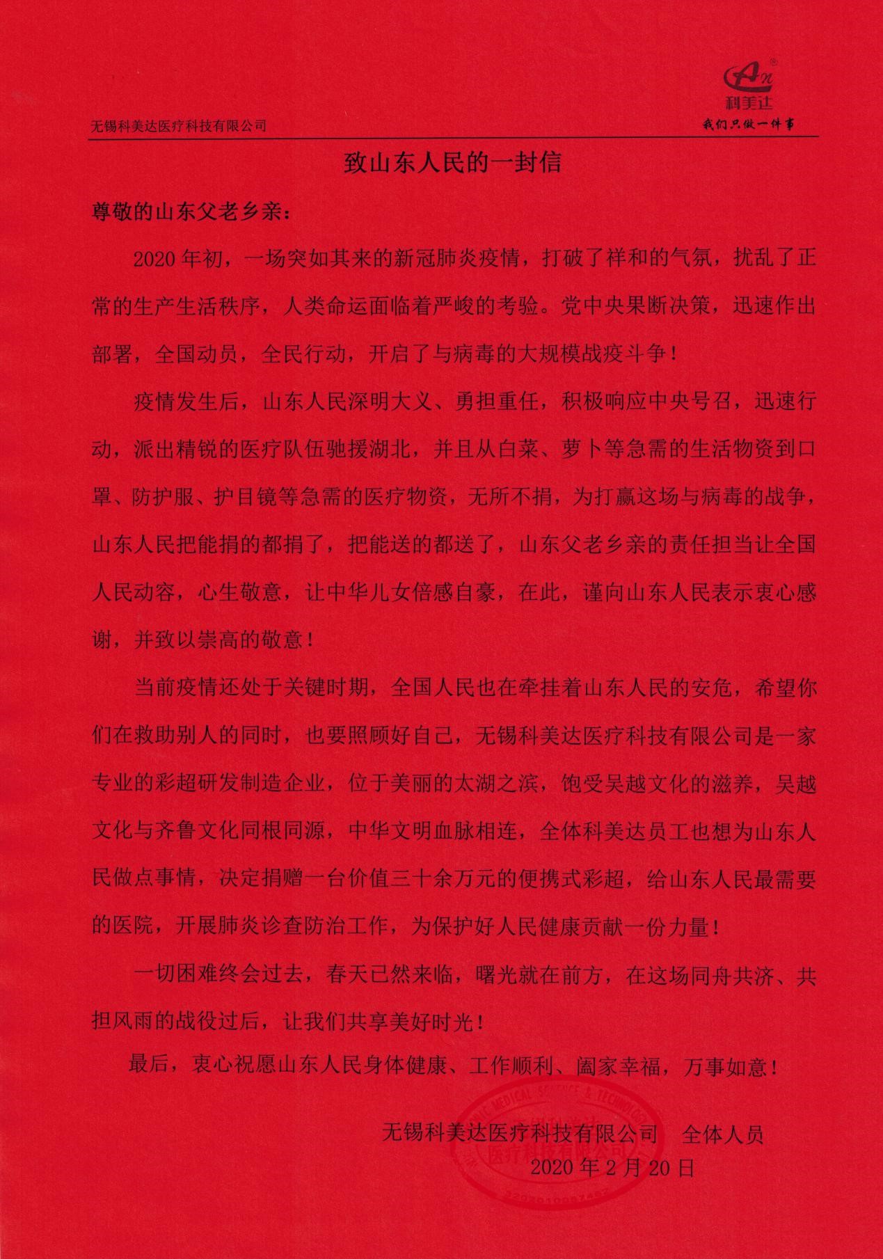庚子年初,新冠肺炎疫情洶涌而來,隨著鐘南山院士馳援武漢指出新冠肺炎存在“人傳人”的現象,一場史無前例的疫情攻堅戰在全國打響。武漢告急,全國馳援,從生活物資到醫療用品源源不斷往最需要的地方,山東人民搬家式的支援抗疫模式更是感動了全國人民,彩超作為新冠肺炎病情診斷的重要手段,得到臨床專家的重視,為緩解疫情防控期間醫療物資緊缺狀況,有效防范醫護人員感染和疫情擴散風險,科美達公司主動聯系山東省慈善機構,向濟南市鋼城區慈善總會定向捐贈了價值38萬元的便攜式彩超設備,用于濟南市鋼城區醫院抗擊肺炎疫情和人民健康檢查,確保戰略后方穩固。